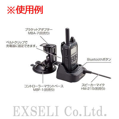 ●別売のマウントブラケットMBA-7、マウントベース MBF-1、シガレットライターケーブルCP-22かCP-23L、スピーカーマイク HM-215を組み合わせて使用することで、アイコム製の携帯型IP無線機を車載用無線機として使用することが可能です(画像参照)。