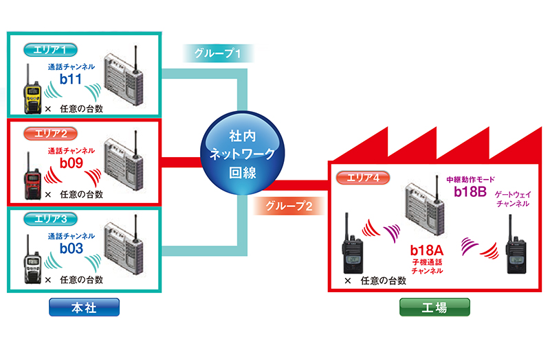 ●特定小電力トランシーバーを社内ネットワーク(イントラネット)に接続し、複数のエリア間で無線通信を行うことができます。