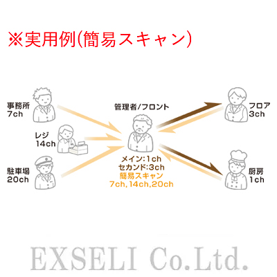 ●メインチャンネル、セカンドチャンネルの他に最大3チャンネルを待受できる簡易スキャン機能搭載しています。一度に多くのエリアの音声を受信したい管理者の方におすすめです。