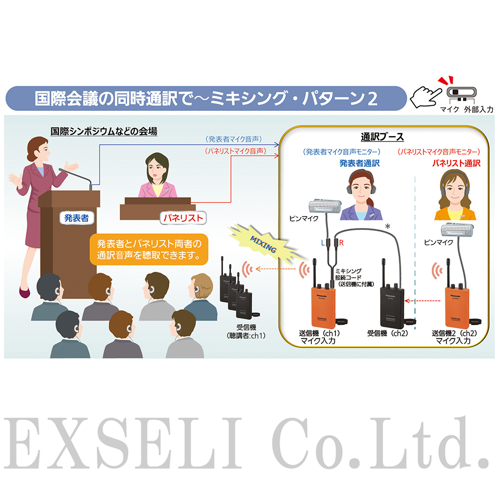 ●国際会議などで、発表者通訳とパネリスト通訳の二人の通訳の音声を同一の送信機から送信することができます。