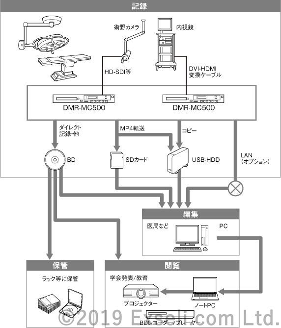 DMR-MC500は映像コンテンツ制作や後進育成のための技術映像の記録など幅広い分野で活躍しているパナソニック製ビデオレコーダーです。医療現場において、内視鏡や術野カメラの映像をフルHDで記録し、映像の保管や学術発表などに活用できます。