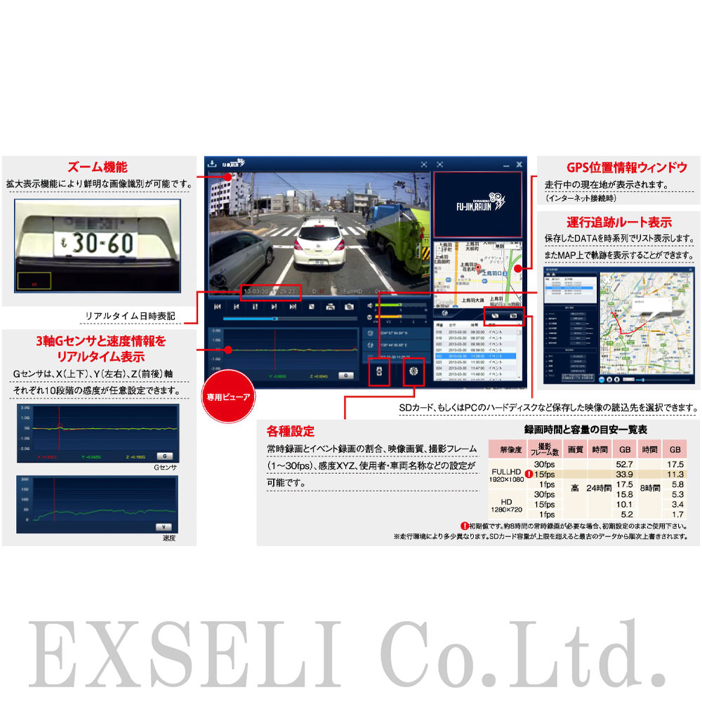 - 取付ブラケット、GPSモジュール、microSDカード16GB(専用PCビューア入り)、SDカードリーダー、両面テープ、ケーブルクランプ、電源ケーブル(ヒューズACC接続タイプ)、取扱説明書、保証書
