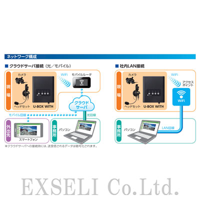 - ●U-BOX WITH (本体型番ST#7703)は、タニザワ(TANIZAWA)製のヘルメットに装着可能なウェアラブルカメラで、現場作業者の映像と音声を約100万画素のHD画質で静止画コマ送りので連続配信できるリアルタイム情報共有システムです。パソコンなどのブラウザ上でリアルタイムに確認できます。