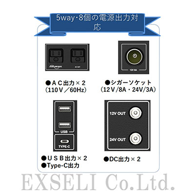 ●5WAY・8個の電源出力対応です。AC(110V/60Hz)を2口、シガーソケット(12V/8A・24V/3A)を1口、USB出力を2口、TYPE-C出力を1口、DC12V出力を1口、DC24V出力を1口備えた電源です。