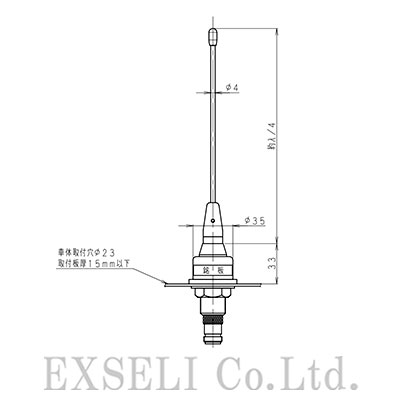 ●穴あけ取付式のホイップアンテナです。車体取付穴φ23mm、取付板厚15mm以下です。取付け場所は車のルーフトップです。