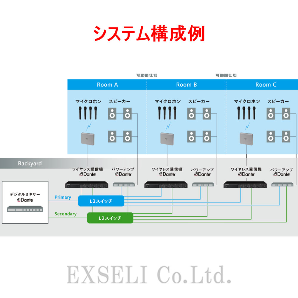 ※Dante®とは、Audinate社が開発したオーディオネットワークの規格のことをいいます。ギガビットイーサネットネットワーク上で、最大512chの非圧縮のオーディオ信号を低遅延で伝送することができます。