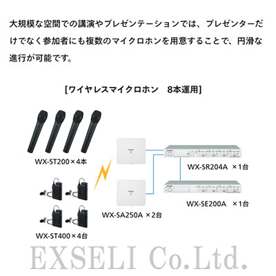 ※対応機: ワイヤレスマイクロホン(バウンダリー型)WX-ST700、ワイヤレスマイクロホン(ハンドヘルド型)WX-ST200、卓上型ワイヤレス送信機WX-ST600+グースネックマイクロホンWM-KG645、ワイヤレスマイクロホン(防滴型)WX-ST210、ワイヤレスマイクロホン(ダイナミック型)WX-ST250、ワイヤレスマイクロホン(タイピン型)WX-ST400、ワイヤレス送信機WX-ST510など