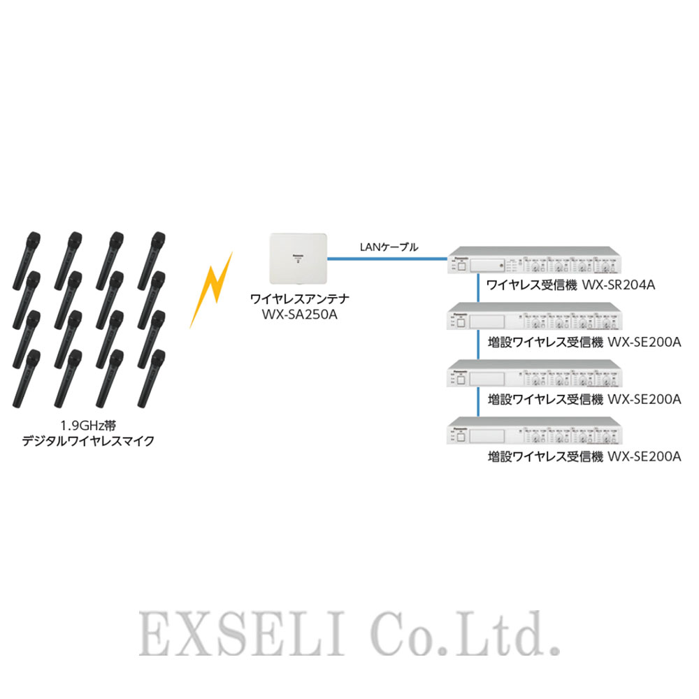 ●WX-SR204Aに増設ワイヤレス受信機WX-SE200Aを3台接続することで最大16本のワイヤレスマイクロホンを使用可能です。