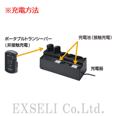 ●ポータブルトランシーバーWX-CT200を5台と別売りの充電池パックWX-SB100を2個、同時に非接触で充電できます。