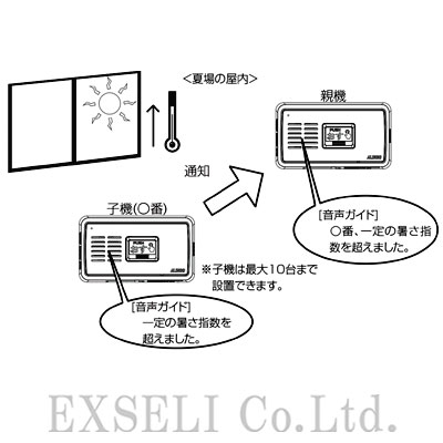 ●子機周辺の温湿度の環境状態(暑さ指数=WBGT)の環境状態(暑さ指数)を親機をに通知し、親機が音声ガイドで知らせます。