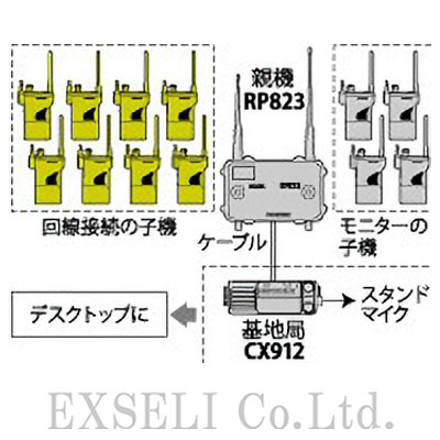 最大9者間で同時通話ができる無線システムです。親機RP824は生産が終了しました。アクセサリの購入は可能です。