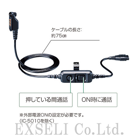 ●タイピン型マイクロホン、ヘルメット取り付け型マイクロホン、ヘッドセットなどをアイコム製の業務用無線機、デジタル簡易無線および一部の特定小電力トランシーバーに接続する時に必要な通話スイッチ内蔵ケーブルです。