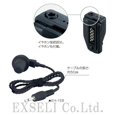 - ●EH-15以外にもイヤホン(黒)EH-15B、ヘルメット取付型スピーカーEH-12、耳掛け型イヤホンEH-13、オープンエアー型イヤホンEH-14、SP-28も装着できます。